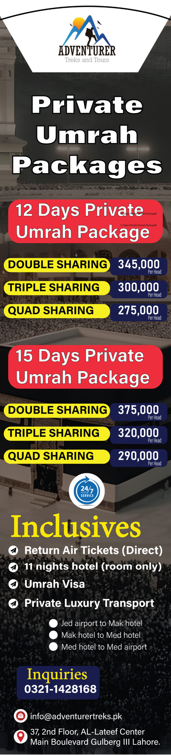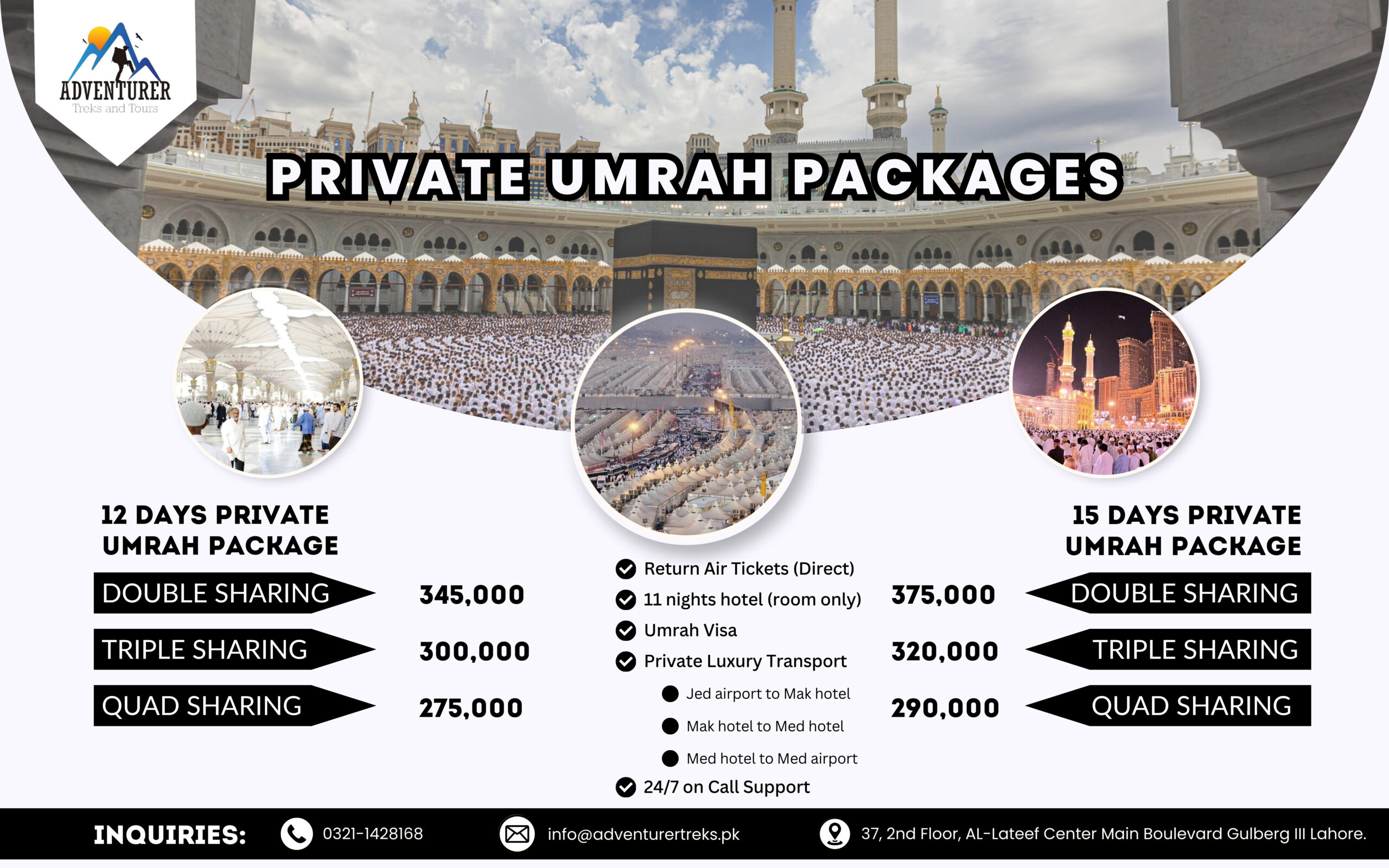 Embark on a deeply spiritual journey with our 12 & 15 Days Private Umrah Packages from Lahore and Islamabad. Designed for comfort and devotion, these packages include premium accommodation near the Haram, hassle-free visa assistance, and convenient transport services. Whether you’re traveling with family or individually, our personalized arrangements ensure a peaceful and memorable Umrah experience, allowing you to focus solely on your prayers and spiritual fulfillment.